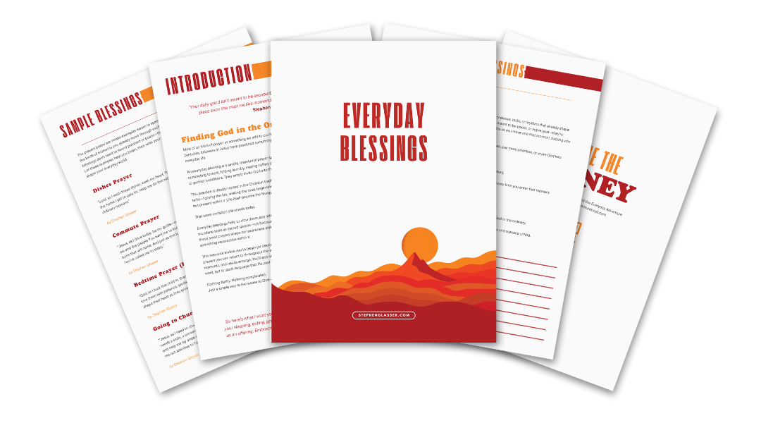 EVERYDAY BLESSINGSTools for a Life of Everyday Adventure Everyday Blessings Activity Everyday Blessings is a guided prayer resource designed to help you notice God’s presence in the ordinary moments of your life. When you download this PDF, you’ll receive a short introduction to the practice of everyday blessings, several written examples, and space to create your own simple prayers for daily rhythms like work, home, family, and transitions. It’s a practical, repeatable tool you can return to again and again as you learn to live more aware, present, and attentive to God throughout your day. First Name Last Name Email Address Download We think spam is lame. Only helpful stuff here.. :) Thank you!